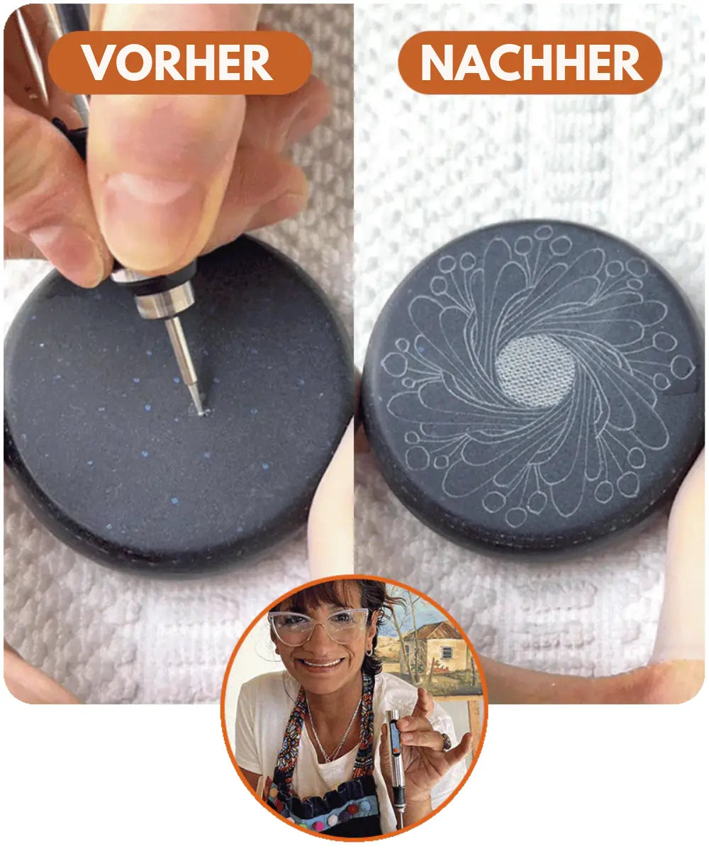 Der CreativePen ist so einfach zu bedienen wie ein Stift. Du brauchst keine künstlerische Erfahrung! Der beiliegende Schnellstarter-Guide und 30 Diamant-Schleifaufsätze sorgen dafür, dass du in wenigen Minuten mit dem Gravieren loslegen kannst.