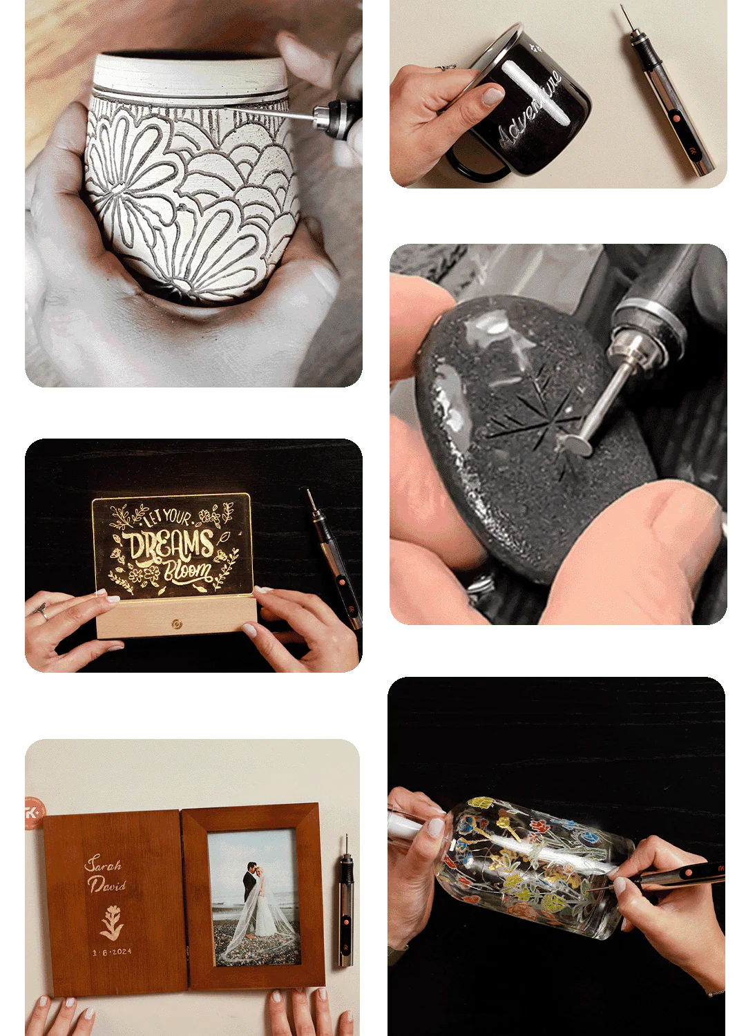 Ob Holz, Metall, Glas, Stein, Keramik oder Kunststoff – der CreativePen meistert jedes Material mit Leichtigkeit! Personalisiere Schmuckstücke, gestalte individuelle Geschenke, beschrifte Werkzeuge oder kreiere einzigartige Kunstwerke für Dein Zuhause.