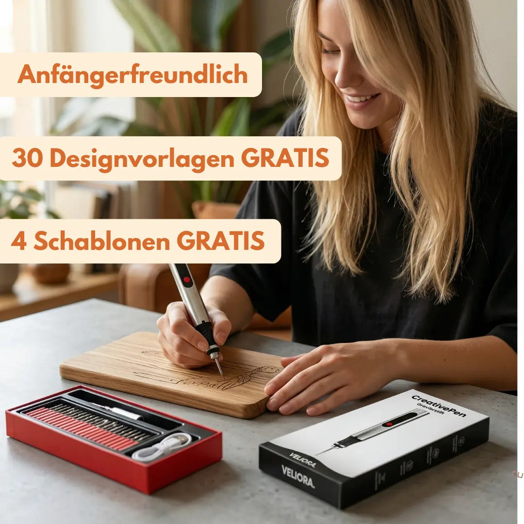 Der CreativePen ist so einfach zu bedienen wie ein Stift. Du brauchst keine künstlerische Erfahrung! Der beiliegende Schnellstarter-Guide und 30 Diamant-Schleifaufsätze sorgen dafür, dass du in wenigen Minuten mit dem Gravieren loslegen kannst.